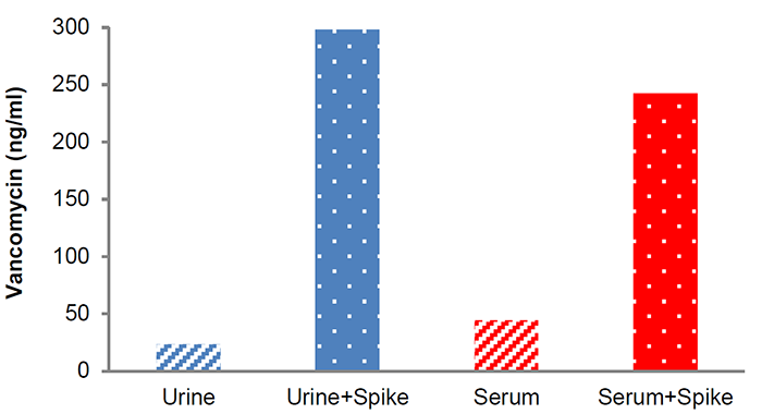 加標(biāo)回收實(shí)驗: 人血清和尿液樣本加300ng/ml的萬古霉素,回收率為80-100%。