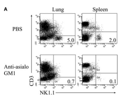 文獻(xiàn)來源:Zhou G, et al. 2013. Eur. J. Immunol. 43:929. 該圖顯示尾靜肪注射anti-asialo GM1或PBS,每五天一次,不管是肺還是脾臟,都顯示出NK細(xì)胞消耗率。