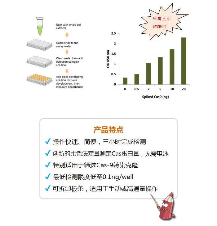 傳統(tǒng)方法操作復雜、花費大量時間與精力,針對這個特點,Epigentek研發(fā)出了通過ELISA檢測Cas9蛋白含量,進而篩選轉(zhuǎn)化子的檢測試劑盒。該試劑盒僅需要純化的Cas9 核酸酶和全細胞提取物(分離自各物種的組織和培養(yǎng)的細胞),就能夠特異性定量檢測CRISPR相關(guān)蛋白9(Cas9,dCas9)。