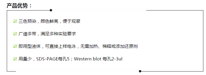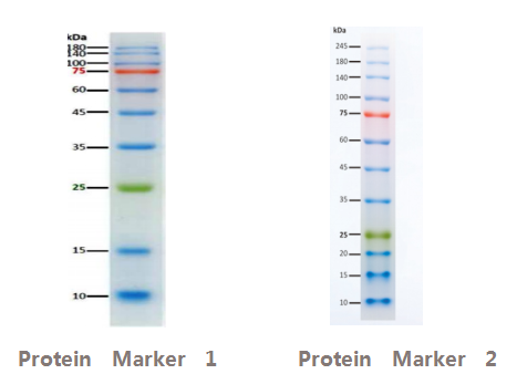 BioSciTM ColorBandTM Prestained Protein Marker 是一種三色預(yù)染的即用型蛋白分子量標(biāo)準(zhǔn)品,包括十種分子量從的預(yù)染重組蛋白,經(jīng)SDS-PAGE凝膠電泳或轉(zhuǎn)膜后可觀察到清晰的彩色蛋白條帶,其中25KD為綠色條帶,75KD為紅色條帶,其余條均為藍(lán)色條帶。