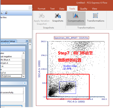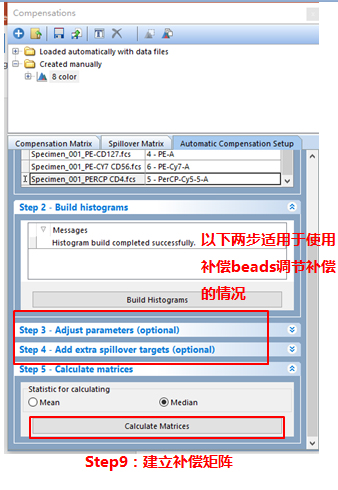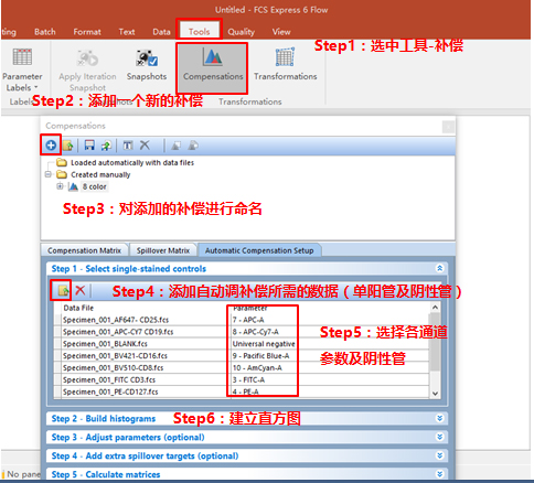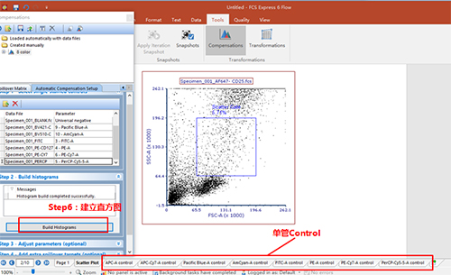 依次調(diào)整好各單管Control的Marker門的位置。此處不一一列舉。回到補(bǔ)償界面。此處的3、4適用于使用補(bǔ)償beads調(diào)節(jié)補(bǔ)償?shù)那闆r(由于本次數(shù)據(jù)為細(xì)胞,此處不詳細(xì)列出,如對(duì)此步驟感興趣,可咨詢小達(dá)君)