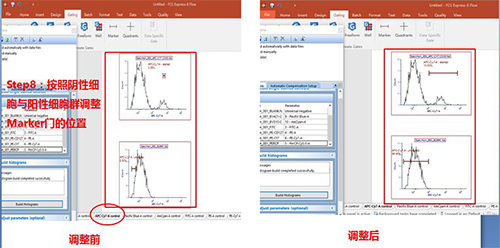 圈好門之后,選中單管Control版面,按照陰性細(xì)胞與陽(yáng)性細(xì)胞的位置調(diào)整Marker門的位置。