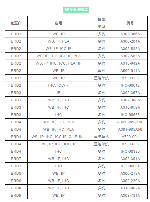 Bethyl認識到BRD4在細胞周期調(diào)控和腫瘤發(fā)生中的重要性,研發(fā)了質(zhì)量優(yōu)秀的BRD4抗體,以及許多其他相關蛋白質(zhì)的抗體,以促進癌癥研究發(fā)展。