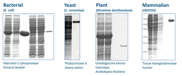 因His-tag系統(tǒng)使用Ni離子,所以在純化金屬蛋白(多數(shù)為酶)時,可能會受到金屬間交互作用的干擾。而使用Strep-tag? 則不會出現(xiàn)此問題,因為Strep-Tactin? XT與Strep-tag?的特異性結(jié)合不受金屬離子影響。且因其溫和的純化流程,所以還能用于純化大型蛋白、多亞基的蛋白復(fù)合體或是跨膜蛋白,并且保持蛋白功能。以Strep-tag?系統(tǒng)純化出不同的蛋白實(shí)例如下: