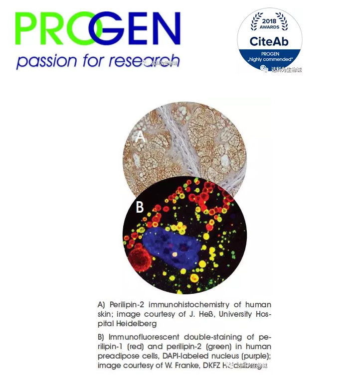脂代謝與各種疾病的關(guān)系還需要需要更多的研究數(shù)據(jù),可靠的抗體是可靠結(jié)果的有力保證。Progen,德國品質(zhì),始于1983,是目前可提供較全PLIN1-5抗體以及發(fā)表文章較多的生產(chǎn)商,榮獲2018年CiteAb頒發(fā)的highly commended awards 。