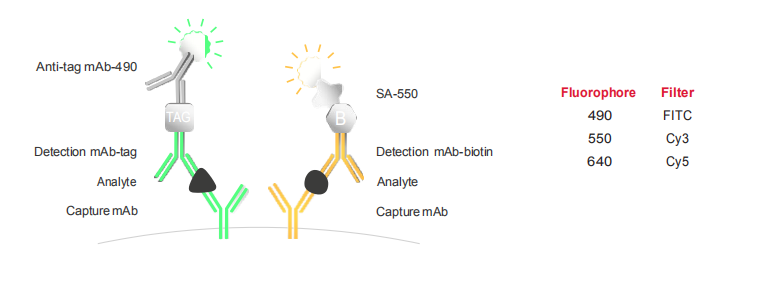 FluoroSpot能夠分析抗原特異性的多功能T細(xì)胞,例如,IFN-γ和IL-2的分析。三明治夾心結(jié)構(gòu)在熒光斑點(diǎn)中得以應(yīng)用,不同特異性的單克隆捕獲抗體混合物被包被于96孔板的PVDF膜上,生物素標(biāo)記的檢測(cè)抗體識(shí)別一種分泌物,tag標(biāo)記的檢測(cè)抗體識(shí)別其它的分泌物來實(shí)現(xiàn)雙色或三色細(xì)胞因子分泌細(xì)胞的檢測(cè)。檢測(cè)通過帶有特定熒光基團(tuán)的共軛試劑放大信號(hào)斑點(diǎn),可用自動(dòng)讀板器進(jìn)行分析。