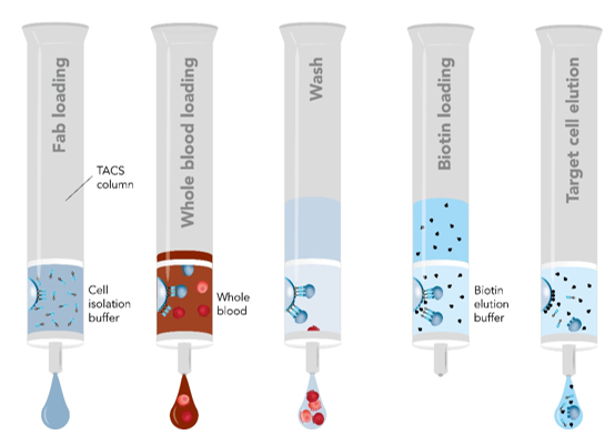 Fab-TACS柱子填充了包被有Strep-Tactin? 多聚體的細(xì)胞級瓊脂糖基質(zhì),偶聯(lián)上Strep-tag的Fab片段(Fab-Streps)特異性的結(jié)合到瓊脂糖基質(zhì)上。隨后,加入全血或其他血液制劑流過柱子。目的細(xì)胞通過特異性的與Fab-Streps作用從而結(jié)合到瓊脂糖基質(zhì)上,其他非目的細(xì)胞則有效的被洗去。最后,加入生物素使目的細(xì)胞從Fab-Streps上解離。至此,就已分離得到不帶任何標(biāo)記的、真實的目的細(xì)胞可用于下游的實驗研究。