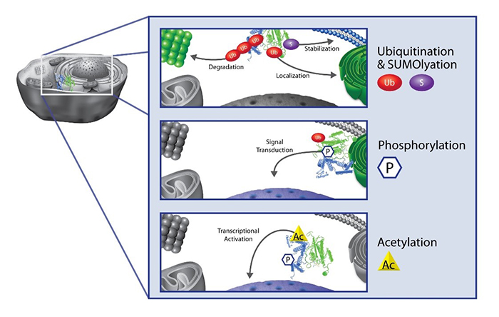 盡管目前已知的PTM的種類超過400種,但只有少數(shù)幾個被詳細(xì)研究過,主要包括甲基化、磷酸化、乙酰化、泛素化和SUMO化,它們被證明是幾乎所有細(xì)胞的關(guān)鍵調(diào)節(jié)因素,包括信號轉(zhuǎn)導(dǎo)、表觀遺傳學(xué)、基因和蛋白質(zhì)表達、蛋白質(zhì)穩(wěn)定性和定位以及細(xì)胞免疫。
