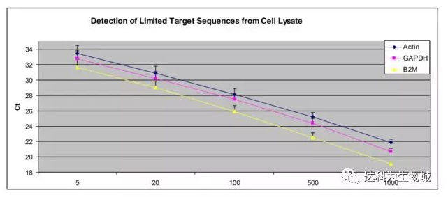 隨著HeLa細胞數(shù)的增加,分別用適量細胞裂解液裂解細胞后進行反轉錄,而后在7700 PCR儀上進行Actin、GAPDH和B2M基因的3復孔qPCR反應。