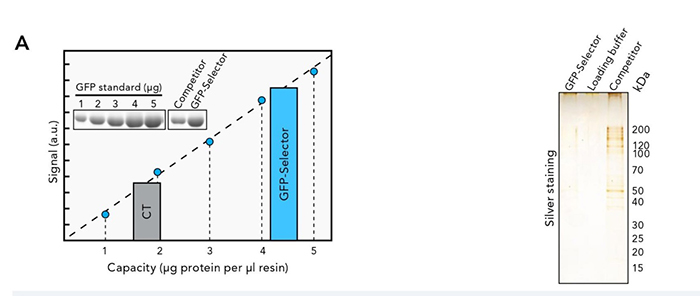 將GFP Selector和競爭產(chǎn)品與飽和的重組GFP蛋白孵育,通過SDS-PAGE和考馬斯染色分析1μl樹脂的容量;