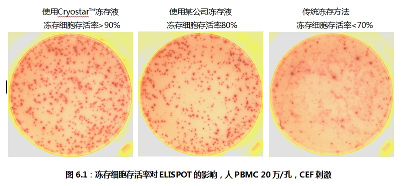 在ELISPOT檢測的應(yīng)用中,往往需要用到凍存的淋巴細(xì)胞樣品作為檢測細(xì)胞。由于ELISPOT檢測的是細(xì)胞的免疫功能,不僅僅需要保持細(xì)胞的存活率,而且還要保證細(xì)胞的功能不發(fā)生變化。傳統(tǒng)的細(xì)胞凍存方法通常是為了保存細(xì)胞株,對細(xì)胞存活率的要求不高,更沒考慮保持細(xì)胞原有的免疫狀態(tài),所以傳統(tǒng)的細(xì)胞凍存方法已經(jīng)不能滿足ELISPOT檢測的要求。參見圖7.1。