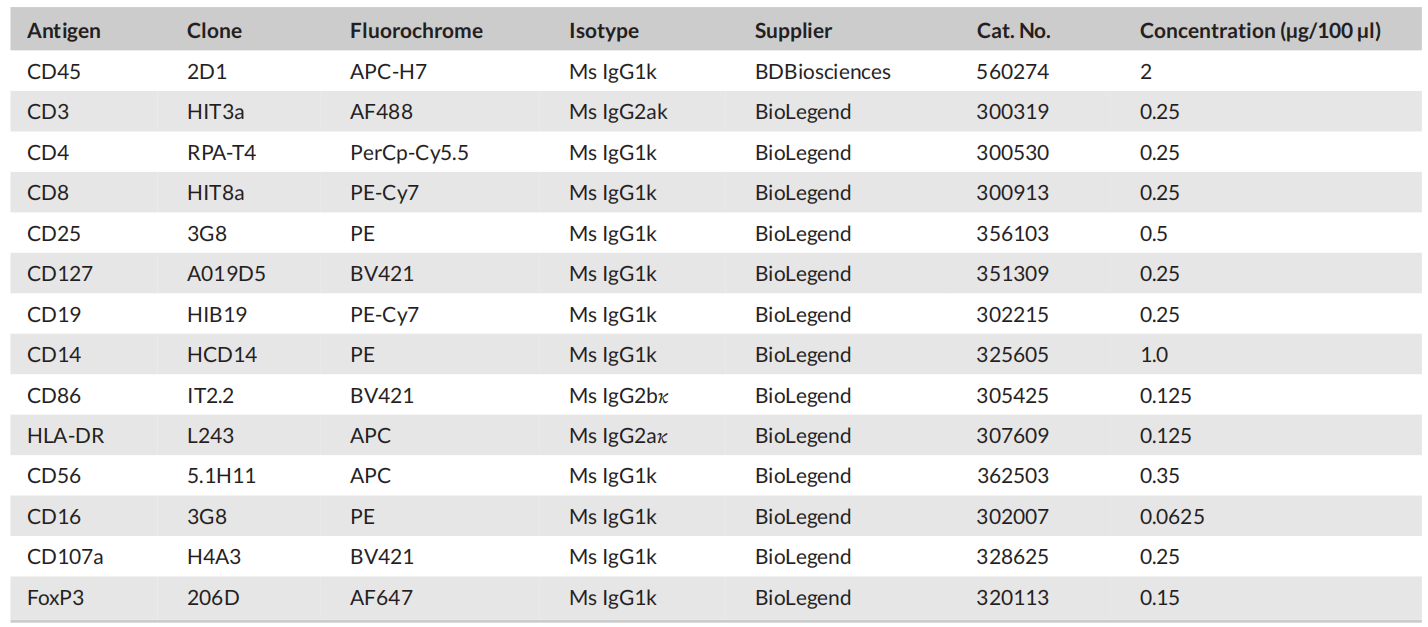 流式分析使用的抗體,如下表所示(BD LSRII flow cytometer):