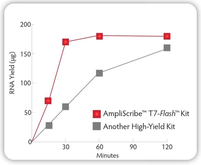 △圖1 AmpliScribeT7-Flash Transcription Kit比競(jìng)爭(zhēng)品牌更快獲得更高產(chǎn)量RNA