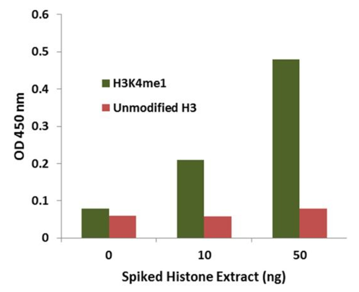 圖2. 使用EpiQuik Total Histone Extraction Kit制備,HL-60細(xì)胞組蛋白提取物,在牛血漿中加入不同質(zhì)量的組蛋白,形成不同濃度溶液樣本。使用EpiQuik Circulating Histone H3K4me1 ELISA Kit檢測H3K4me1的含量。